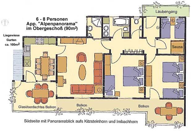 Apartmán pre 6-8 osôb (90m2). Má 3 spálne, 2 kúpelne, 2x WC,Infrasauna, obývačka (25m2) s rozkladacím gaučom a krbom, kábel TV, Internet WLAN, kuchyňa 13m2 s jedálenským kútom, je vybavená chladničkou, mrazničkou, myčkou, varnou doskou s rúrou a kávovarom. Na južnej strane je vlastná záhrada, dva balkóny s výhľadom na Kitzsteinhorn, zastrešené parkovacie miesta a uzamykateľný odkladací priestor.