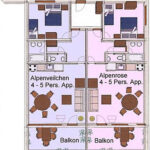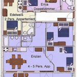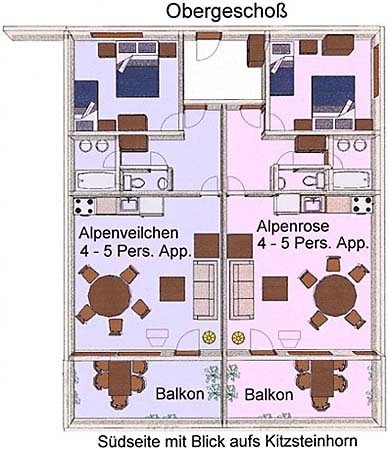 Sú dva apartmány pre 3-4 osoby (po 50m2). Majú spálňu (3 postele), kúpelňu s vaňou a umývadlom, extra WC, veľkú obývačku s rozkladacím gaučom (2 osoby), káblovú TV, Internet WLAN, kuchyňu s jedálenským kútikom vybavenú chladničkou s mrazničkou, rúrou s varnou doskou, myčkou a kávovarom. Sú južne orientované a každý ma svoj balkón s výhľadom na Kitzsteinhorn, parkovacie miesto a odkladací priestor.